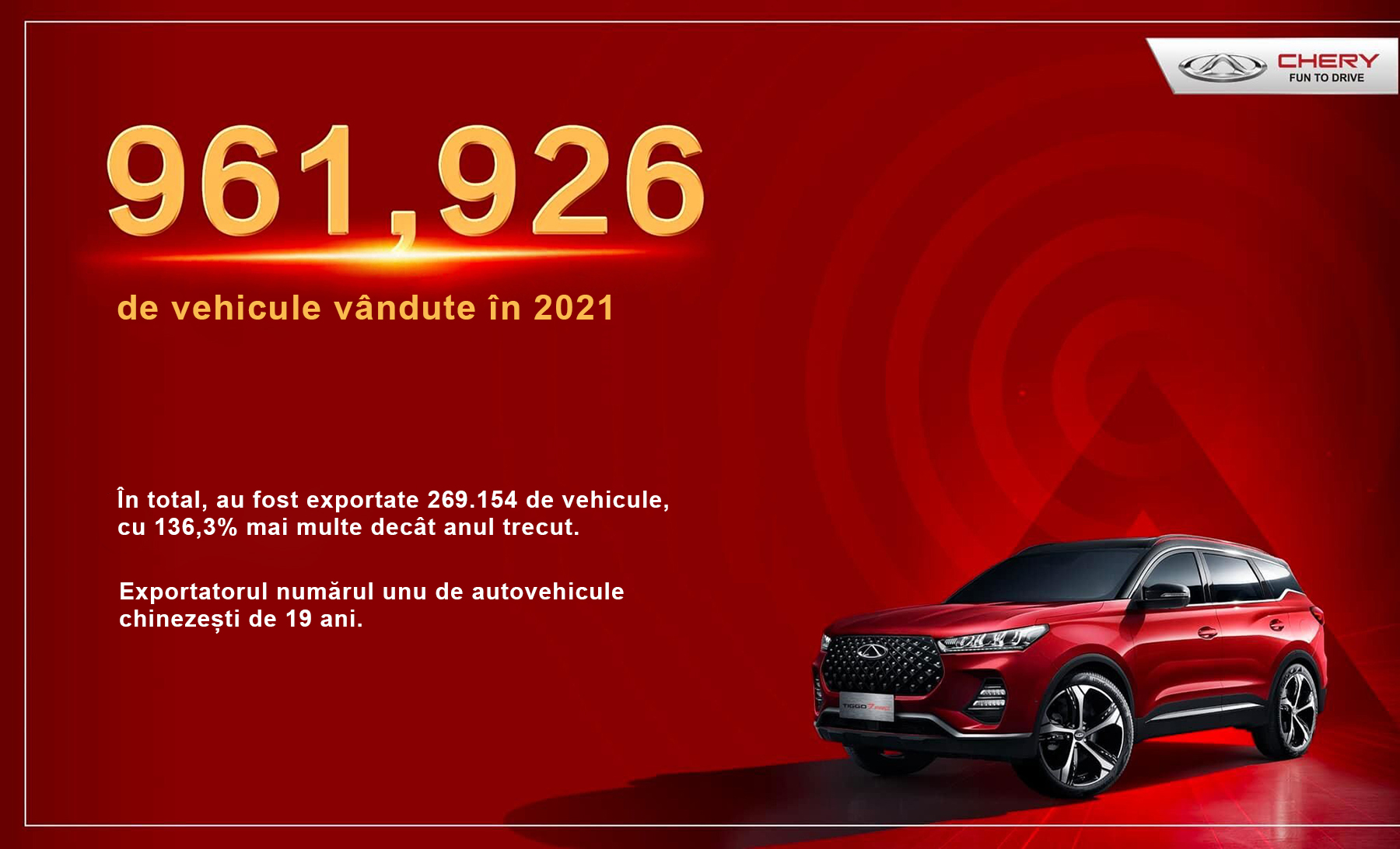 Chery Group a lansat recent datele sale anuale de vânzări: în 2021, vânzările totale de automobile au stabilit un nou record de 961.926 de vehicule, în creștere cu 31,7% față de anul precedent, inclusiv exporturile totale de 269.154 de vehicule, în creștere cu 136,3% față de anul precedent, ocupând primul loc în topul exporturilor de automobile chinezești pentru 19 ani la rând.